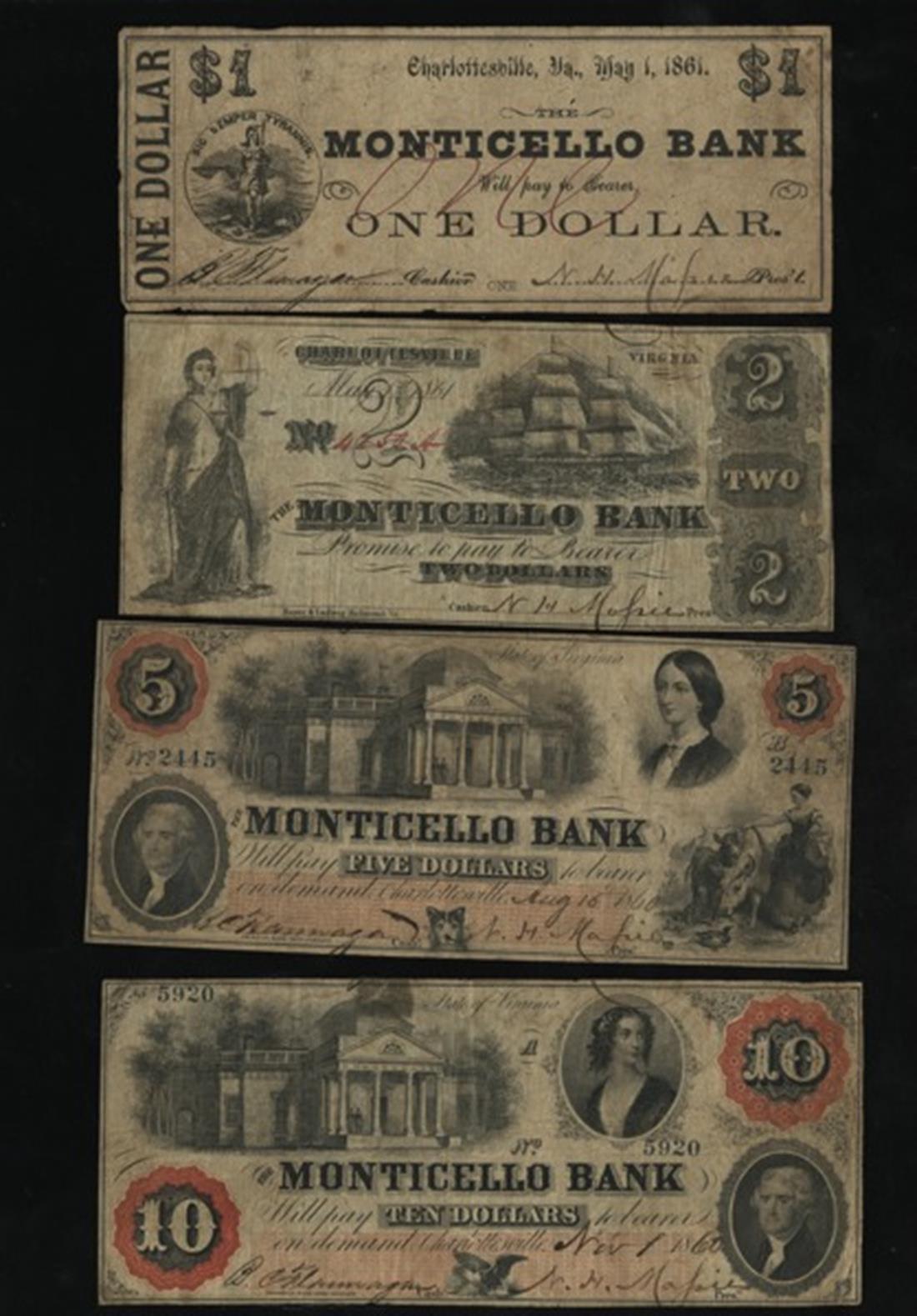 Virginia. Charlottesville. Monticello Bank Assortment. $1 1861 BC25-05A, State arms, About Fine; $2 1861 BC25-10, sailing ship, Justice, Fine; $5 1860 BC25-14, red, Monticello (Jefferson's home), Fine, pencil notations on the back; $10 1860 BC25-26, red, Monticello, left, Fine, repaired edge split at the top. [4]