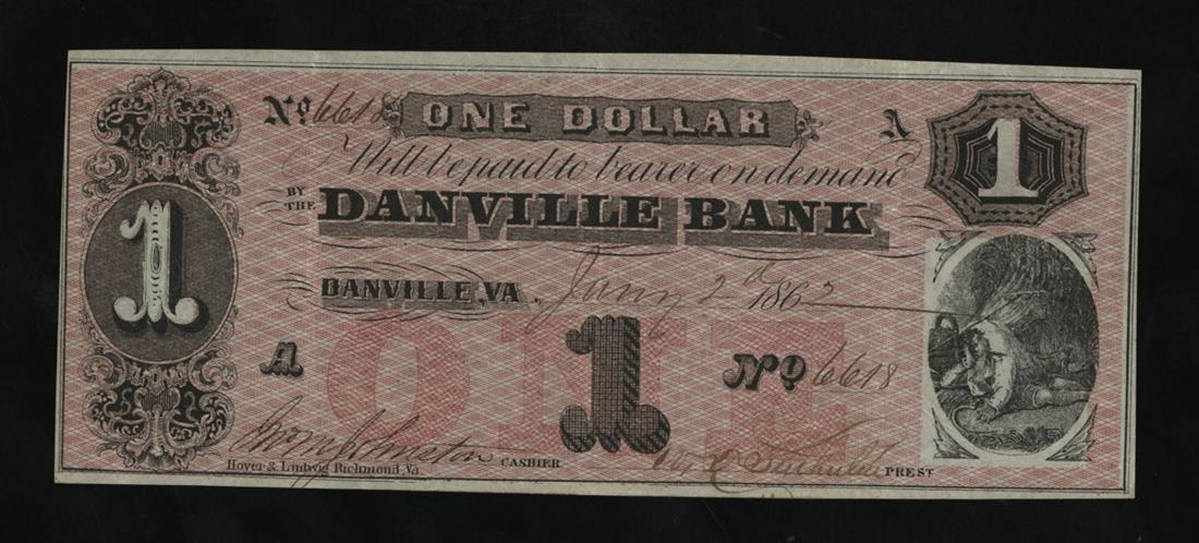 Virginia. Danville. Danville Bank. $1. 1862. (BD05-06). No.6618. Pink underprint. White 1s in counters. Boy reclines by wheat stack. Hoyer & Ludwig. VF-EF.
