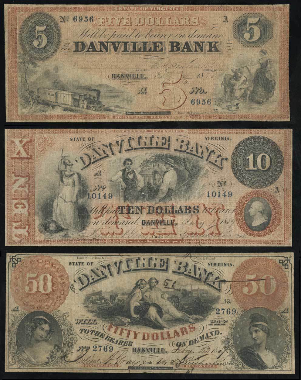Virginia. Danville. Danville Bank Trio. $5 1858 BP05-10, Train, lower left two men and a horse, VG-Fine; $10 1859 BD05-15, About Fine, mounting remnants; $50 1859 BD05-25, two women recline by spinning wheel. Danforth Perkins-ABNCO. Fine details. [3]