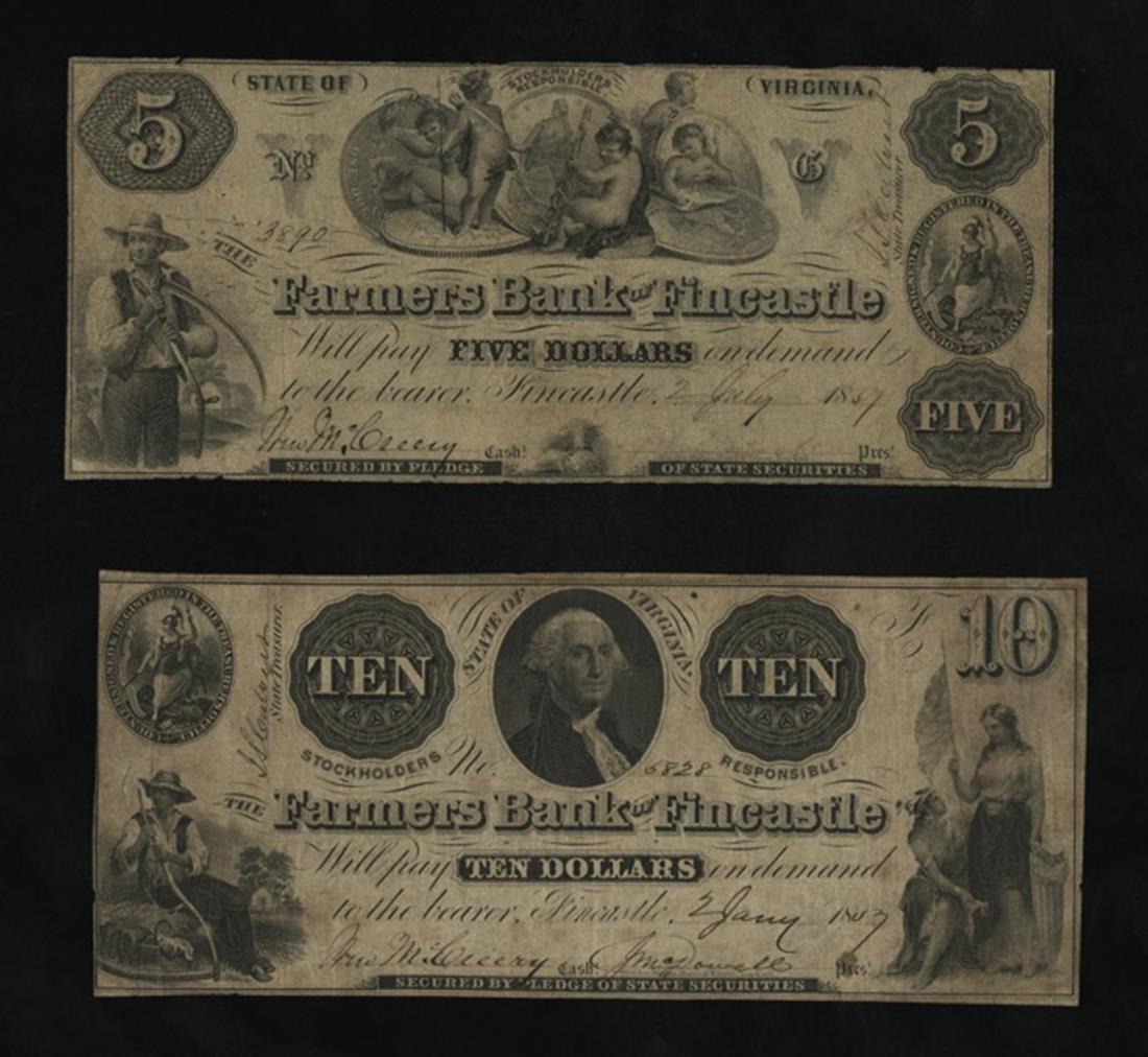Virginia. Fincastle. Farmers Bank of Fincastle Pairing. $5 1857 BF25-30, five cherubs and five silver dollars, Fine; $10 1857 BF25-40, George Washington, Rarity 5F, Fine. [2]