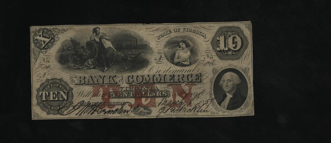 Virginia. Fredericksburg. Bank of Commerce. $10. 1857. (BF30-19) Fully issued. No.202. Red TEN. Woman reclines. Woman with wheat. George Washington. Altered from the Southern Bank of Bainbridge.. Fine or so.