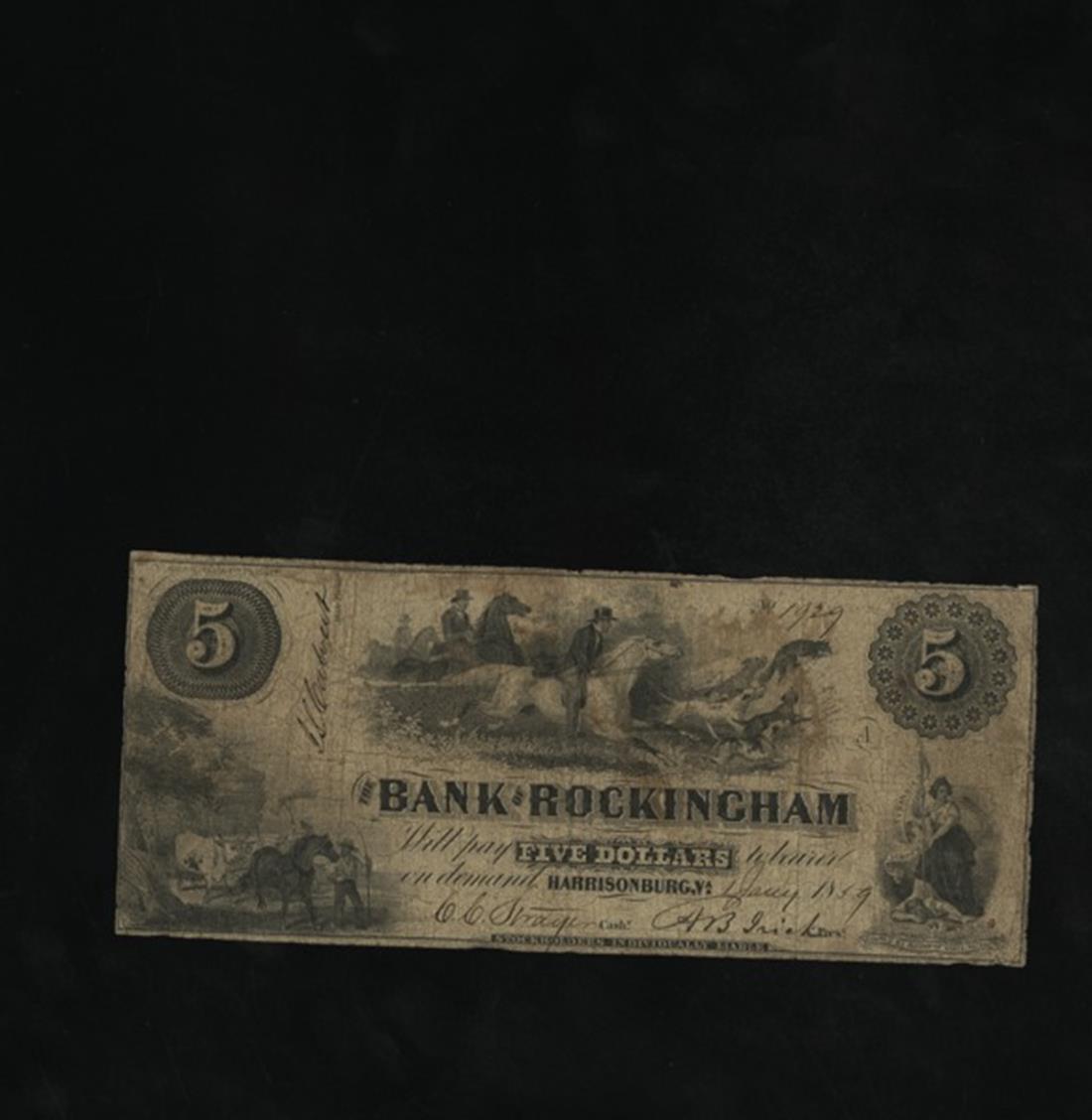 Virginia. Harrisonburg. Bank of Rockingham. $5. Jan. 1859. (BH15-10) Fully issued. No.1929. Red orange back. Fox hunt. Farmer and cows, bottom left. State arms, right. Draper, Welch & Co. Fine.