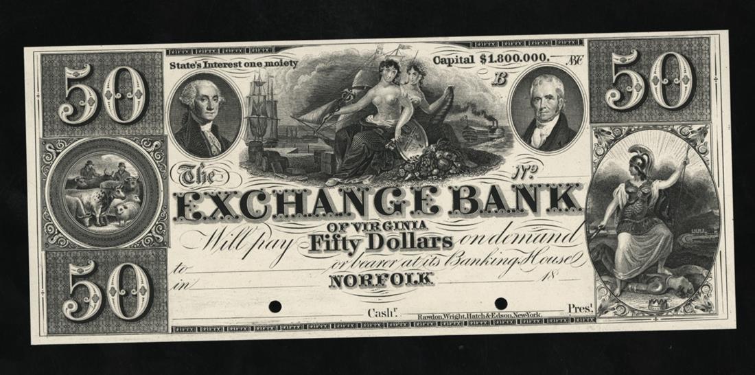 Virginia. Norfolk. Exchange Bank of Virginia. $50. 18__. Proof on card. $50 1850s. BN05-75, semi-nude women, ships beyond. "PROPERTY OF AMERICAN BANK NOTE CO." stamped on back in reddish ink. Uncirculated.