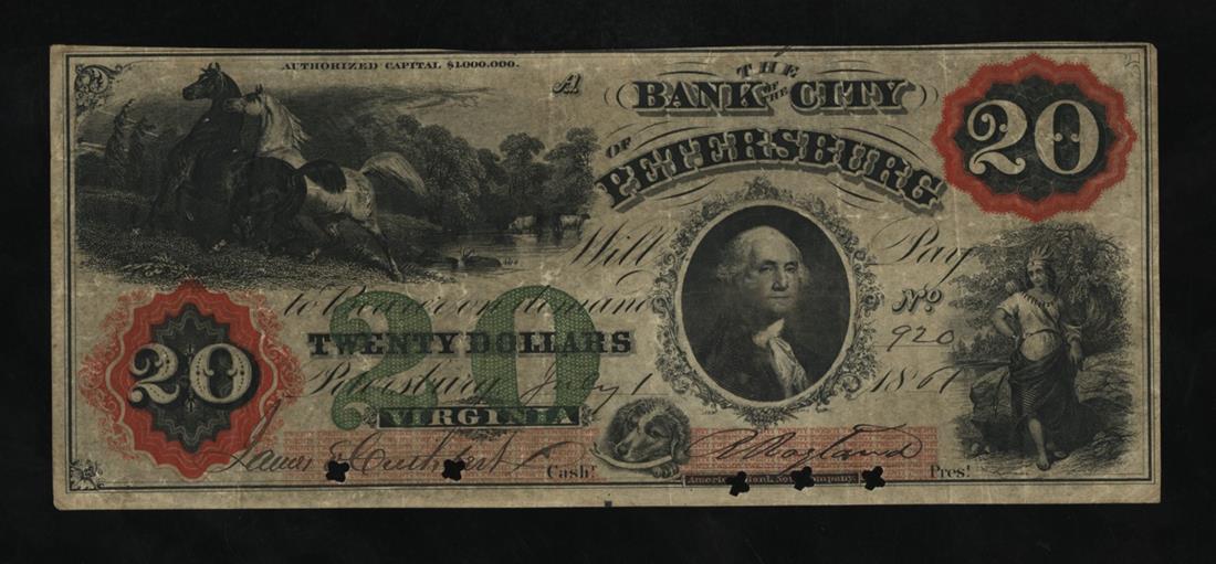 Virginia. Petersburg. Bank of Petersburg. $20. 1861. (BP25-30). No.920. Red and green underprints. Black and white horses. George Washington. Indian Princess. ABNCO. VF-EF.