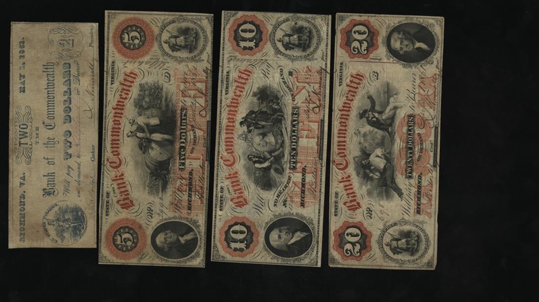 Virginia. Richmond. A Colorful Selection of Bank of the Commonwealth Obsolete Paper Money. $2 1861 BR15-10, all blue, State arms, George Washington, Fine; $5 1861 BR15-25, red, men and tobacco barrels, F-VF; $10 1858 BR15-30, red, men flank Washington shield, State arms, Adams, VF; $20 1861 BR15-36, red, men flank shield, State arms, VF. [4]