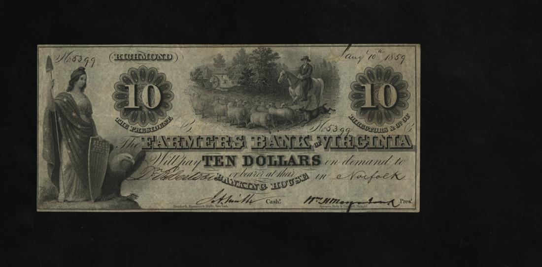Virginia. Richmond. Farmers Bank of Virginia. $10. 1859. (BA25-60). No.5399. Farmer and sheep. Liberty, shield and eagle, left. Branch in Norfolk. Danforth, Spencer and Hufty. VF+.