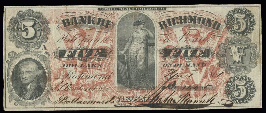 Virginia. Richmond. Bank of Richmond. $5. 1861. (BR85-10). No.1445. Liberty standing with a shield, flanked by a wonderful underprint featuring angels and Jefferson, left. Hoyer and Ludwig. VF details.