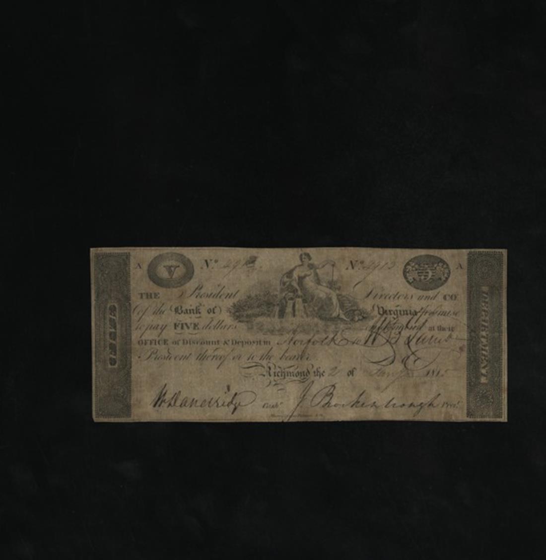 Virginia. Richmond. Bank of Virginia. $5. Jan. 2, 1815. (BR130-30) Fully issued. No.4913. Liberty with four water jugs. Norfolk branch. "DEPARTMENT" in right end panel. MDF. Fine.