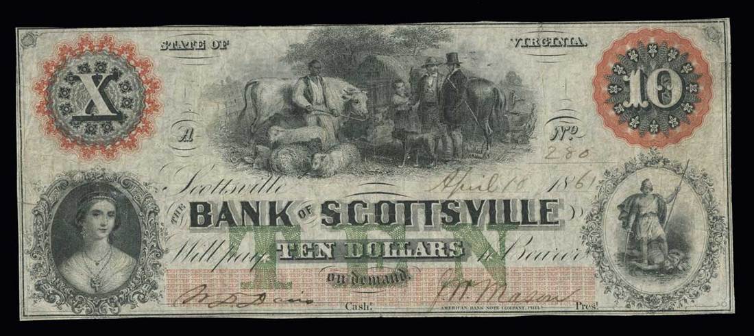 Virginia. Scottsville. Bank of Scottsville. $10. 1861. (BS15-28) Fully issued. No.280. Red counters, green TEN. Farmers and cattle. Girl, left. State arms, bottom right. American Bank Note Company, Philadelphia. Fine-Very Fine.