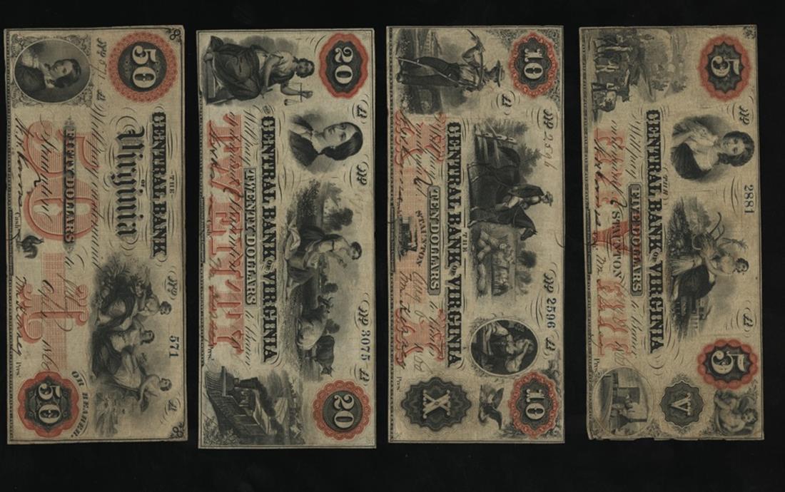Virginia. Staunton. Selection of Colorful Central Bank of Virginia Obsolete Bank Notes. All 1860, all red. $5 BS20-21, Ceres, steam engine below, Fine, pencil notations on the back; $10 BS20-36, overseer on horseback, F-VF; $20 BS20-41, Woman with cattle, VF; $50 BS20-46, three women, rooster below, F-VF. [4]