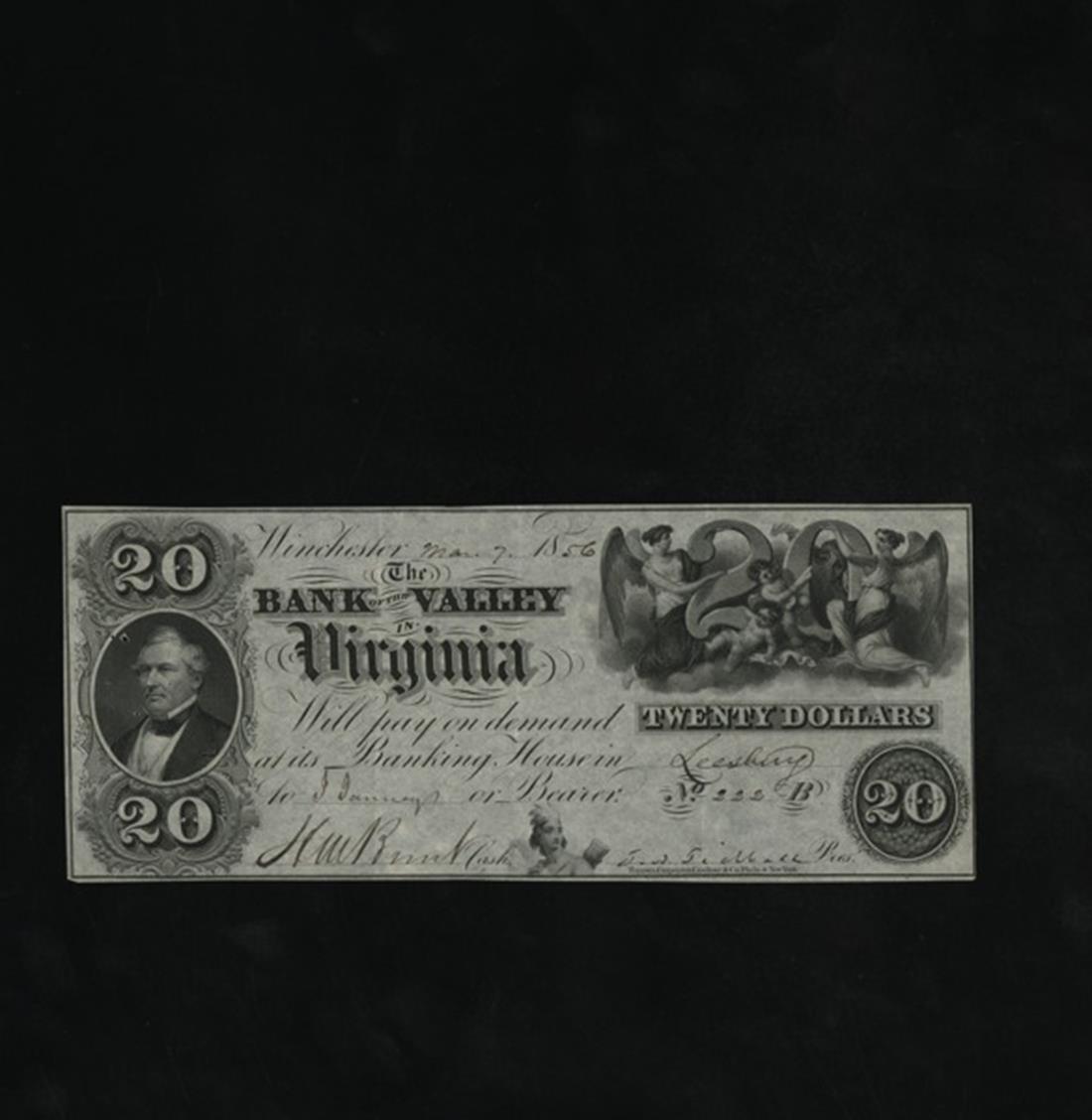 Virginia. Winchester. Bank of the Valley in Virginia. $20. March 7, 1856. (BW50-40) Fully issued. No.222. Leesburg branch. Fillmore, left. Angels and cherubs intertwined with large 20, right. Indian princess below. Toppan, Carpenter, Casilear. EF.