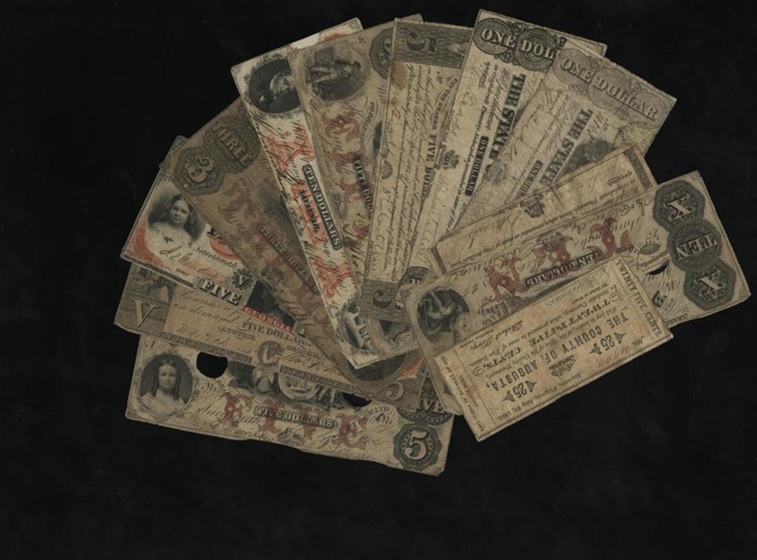 An Assortment of Georgia Obsolete Bank Notes. County of Augusta 25 Cents 1862; State of Georgia 50 Cents 1863; $1 1863 and 1864; $5 1864; Merchants & Planters Bank, Savannah $50 1856, $10 1860 and $3 1850s; Mechanics Bank $5 1854; Bank of Commerce, Savannah $5 & $10 1857. Mostly VG-Fine. The last two are hole cancelled. [12]