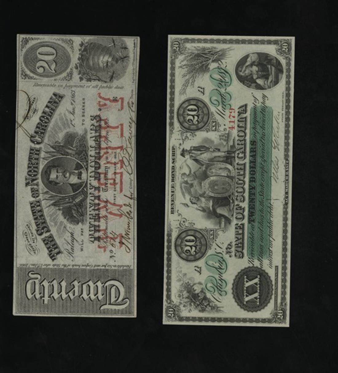 Colorful Pair of $20 State Notes. $20 1863 State of North Carolina Cr.119, Red TWENTY, Governor Vance, Almost Uncirculated; $20 1872 State of South Carolina S14, Liberty and Continental soldier flank shield, Uncirculated. [2] 120-$180