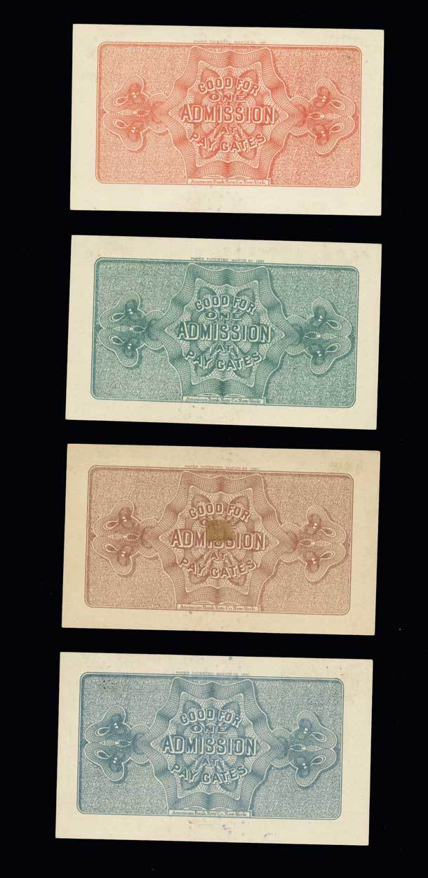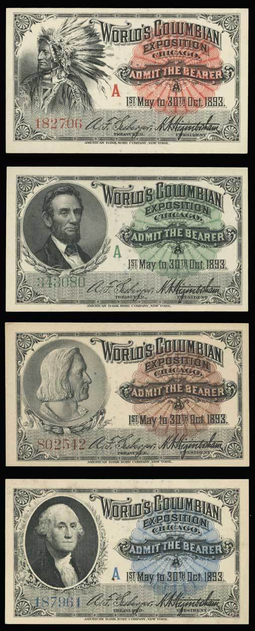 1893 Columbian Exposition Admission Tickets Assortment. Indian Chief; Lincoln; Columbus and George Washington. Uncirculated. Some with minor mounting remnants on the backs. [4]