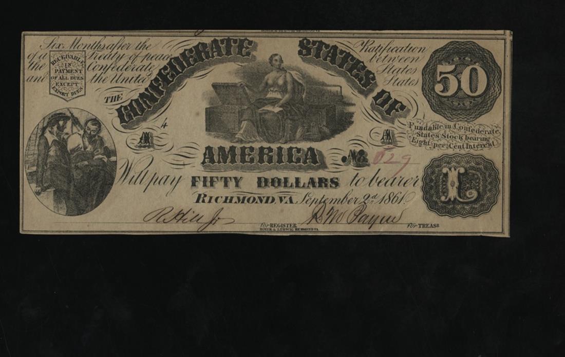 CSA. T-14. $50. 1861. Cr. 76. PF-7. No.629. A4. Moneta with money chest. Sailors. Almost Uncirculated. Light age toning throughout, but the margins are full and generous for this issue.