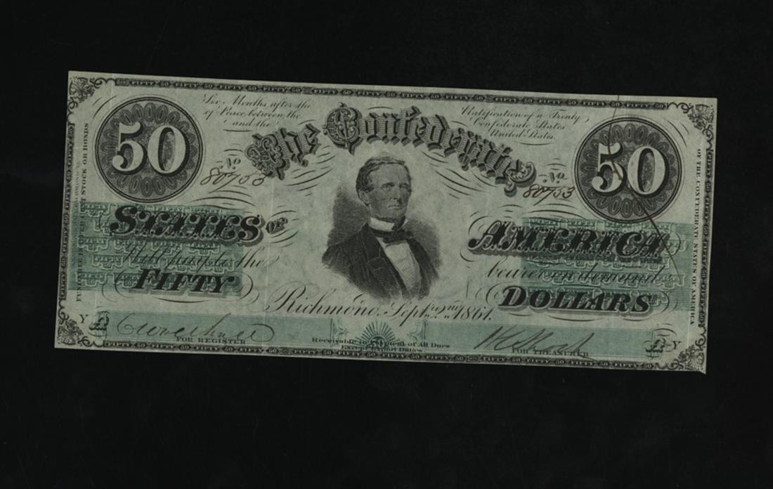 CSA. T-16. $50. 1861. Cr. 81. PF-3. No.80753. YA. Jefferson Davis. Green underprint. CSA script watermarked paper. Very Fine+. Seven vertical folds. The margins are nearly complete.