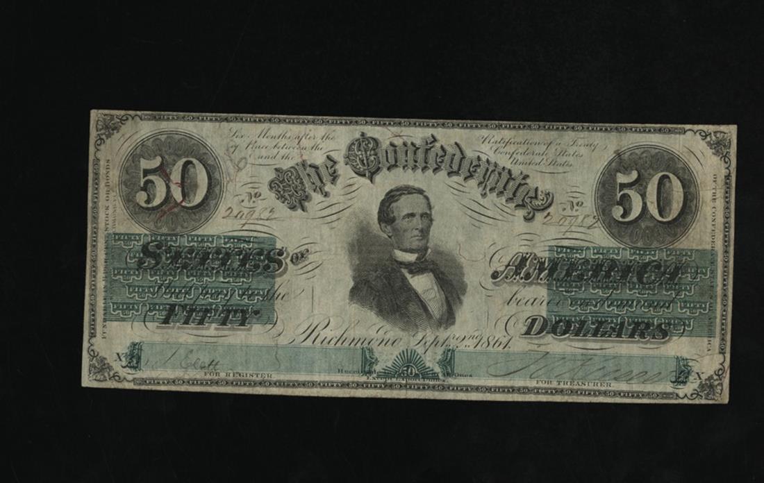CSA. T-16. $50. 1861. Cr. 83. PF-11. No.20982. XA. Jefferson Davis. Green underprint. Red fiber paper. Fine.
