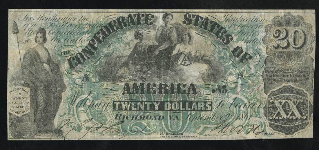 CSA. T-17. $20. 1861. PF-2. No.19871. A. Three women. Green overprint, long tendrils. "For" printed. Fine. Trimmed slightly into the borders at the sides. The paper retains some crispness.