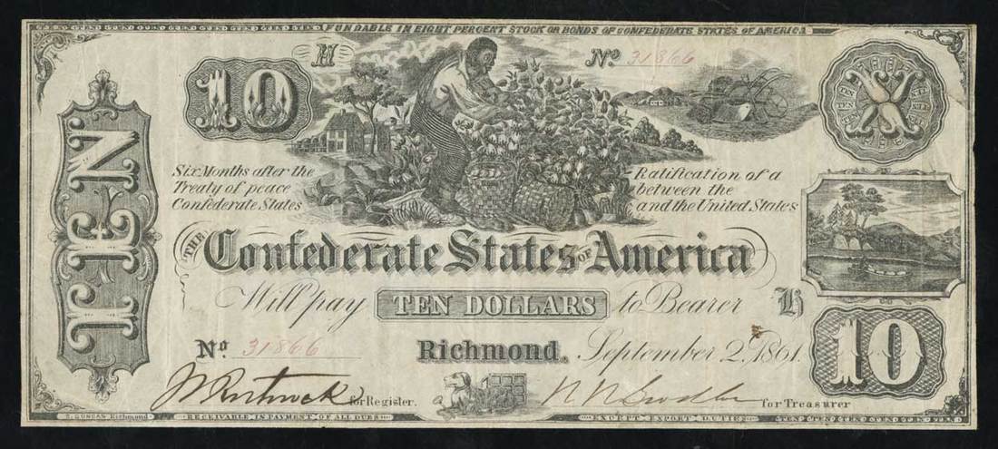 CSA. T-29. $10. 1861. Cr. 237. PF-1. No.31866. H. Slave picking cotton. Fine. With full margins. There is a pinhole well hidden in the vignette in the right end panel, and a minor rust spot; hardly distracting.
