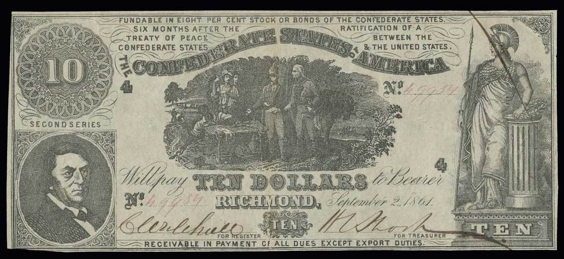 CSA. T-30. $10. 1861. Cr. 239. PF-3. No.49957. 4. "General Francis Marion's Sweet Potato Dinner." R. M. T. Hunter, left. Second series. Almost Uncirculated. With full margins. A penned line through the top of Minerva at right is a continuation of the Treasurer's signature from the note that was printed above this example.