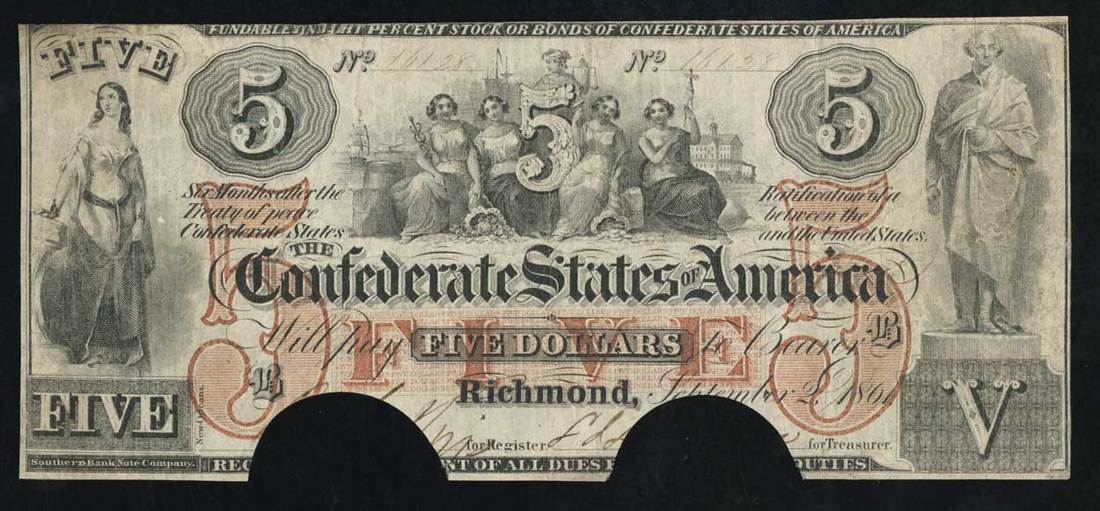 CSA. T-31. $5. 1861. Cr. 244. PF-1. No.16128. B. Five women. Red underprint. Southern Bank Note Company. Red serial numbers, and perhaps the lowest reported thus far. Fine. Cut out cancelled at the bottom.