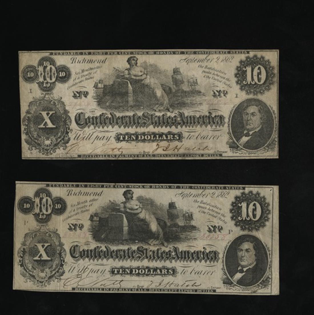 CSA. Both Varieties of T-36 $10 1862 Notes. "Six Month" and "Six Months". Both Fine or so. [2]