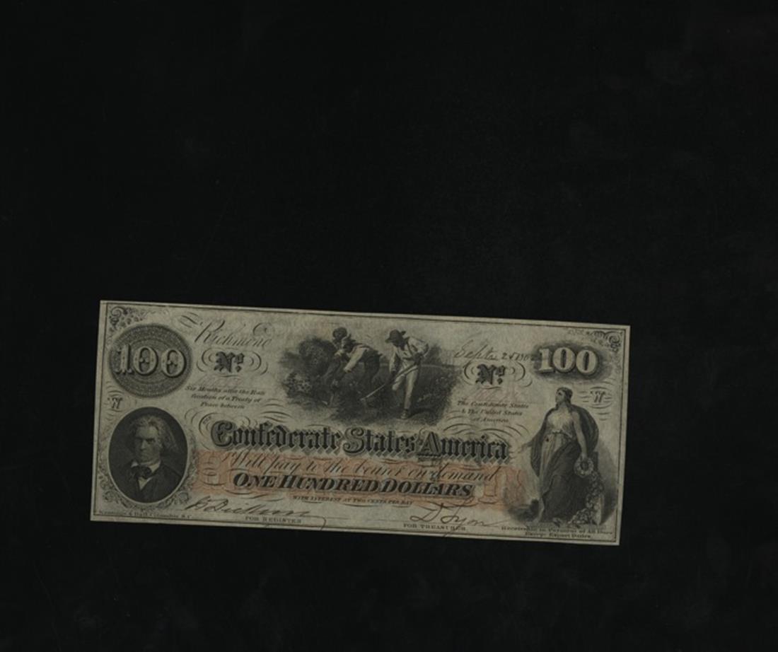 CSA. T-41. $100. 1862. Cr. 319A. PF-11. No.16978. W. Slaves hoe cotton. John C. Calhoun. Columbia, right. Red underprint. "WRITE TO J. H. CHILDREY, 1722 MAIN ST., Richmond, VA FOR CONFEDERATE MONEY, STAMPS, BONDS, COINS…" printed on the back. CSA script watermark. Uncirculated. Teller handling.