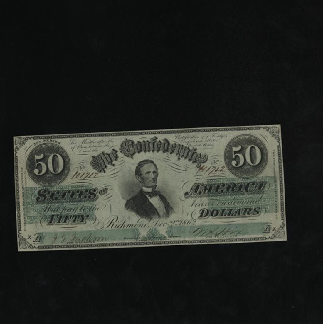 CSA. T-50. $50. 1862. Cr. 355. PF-9. No.101717. Z. Jefferson Davis. Green underprint. . VF-EF. Full margins, decent color. A very attractive note.