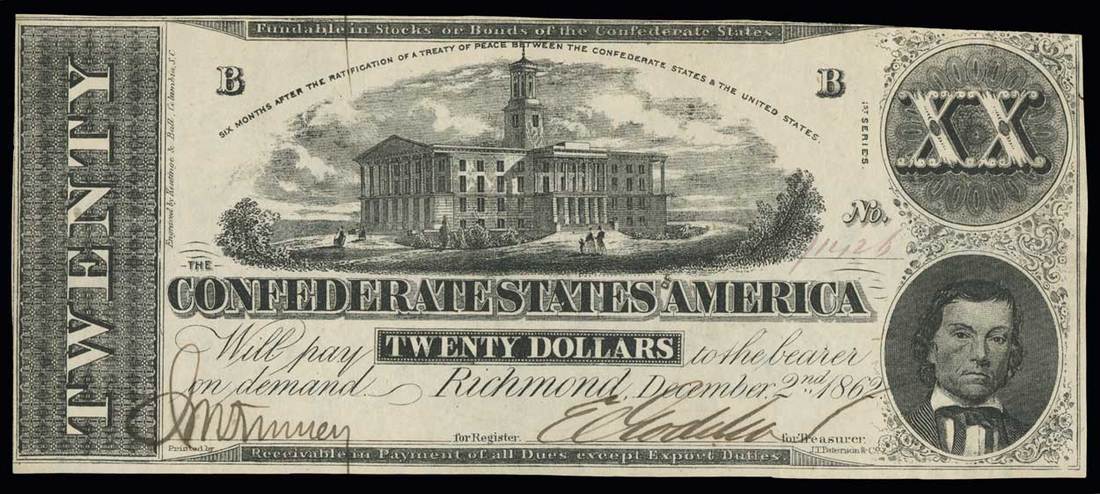 CSA. T-51. $20. 1862. Cr. 363. PF-1. No.11426. B. Capitol at Nashville. Shaded tower. Printed by J. T. Paterson & Co., bottom. Alexander Stephens, right. Uncirculated. Natural paper wrinkles along the top. Archival pencil notation on the vivid blue back. Trimmed just into the upper right margin.