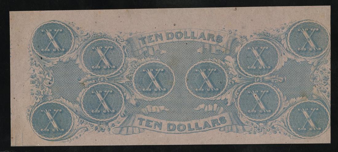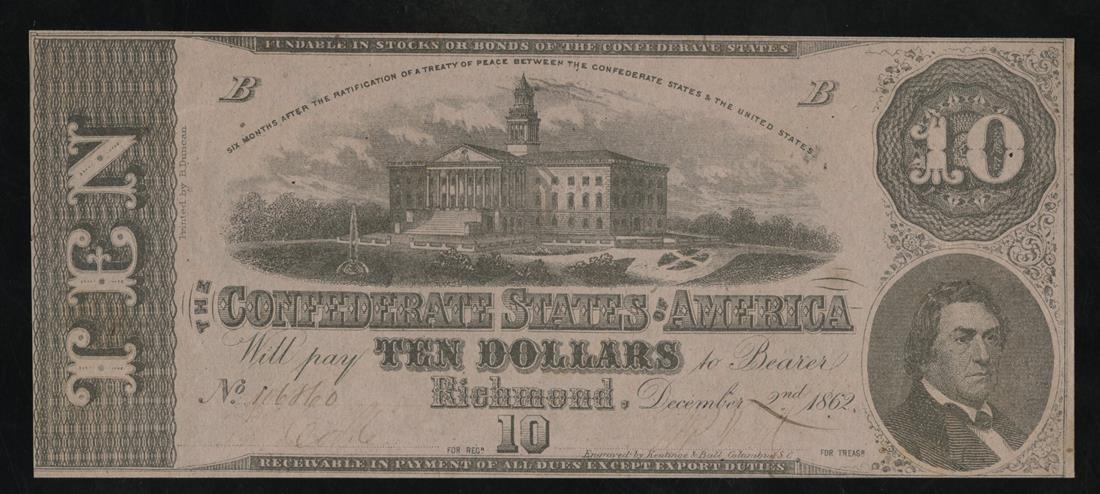 CSA. T-52. $10. 1862. Cr. 369. PF-1. No.116860. B. Capitol, Columbia. R. M. T. Hunter, pink paper. Uncirculated. Complete borders.