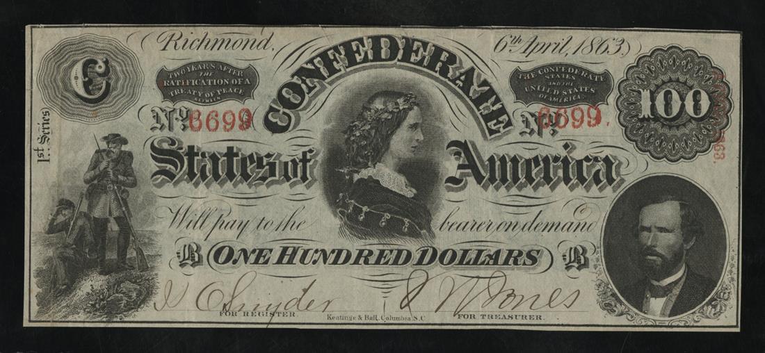 CSA. T-56. $100. 1863. Cr. 403. PF-1. No.6699. B. Lucy Pickens. 1st Series. VF-XF. Complete borders. Great "radar" serial number.