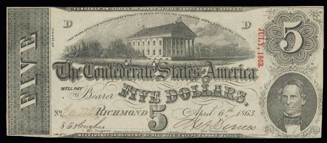 CSA. T-60. $5. 1863. Like. Cr. 453. Like. PF-11. No.29222. D. Capitol at Richmond. Memminger. 2nd series, small letters, over 2nd series. Uncirculated.