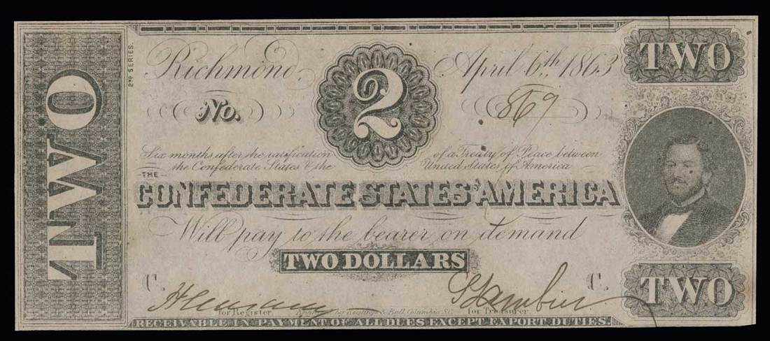 CSA. T-61. $2. 1863. Cr. 471. PF-6. No.869. C. Judah P. Benjamin. Pink paper. Engraved by Keatinge & Ball. 2nd series. Periods after plate letters. Uncirculated. Full margins all around. A few small ink spots, but hardly distracting.