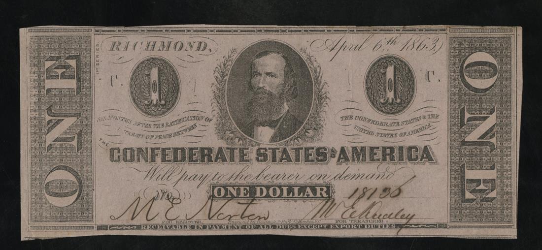 CSA. T-62. $1. 1863. Cr. 474. PF-1. No.18135. C. Clement Clay. Pink paper. 1st series. Periods after plate letters. Almost Uncirculated. Light archival pencil notations on the back.