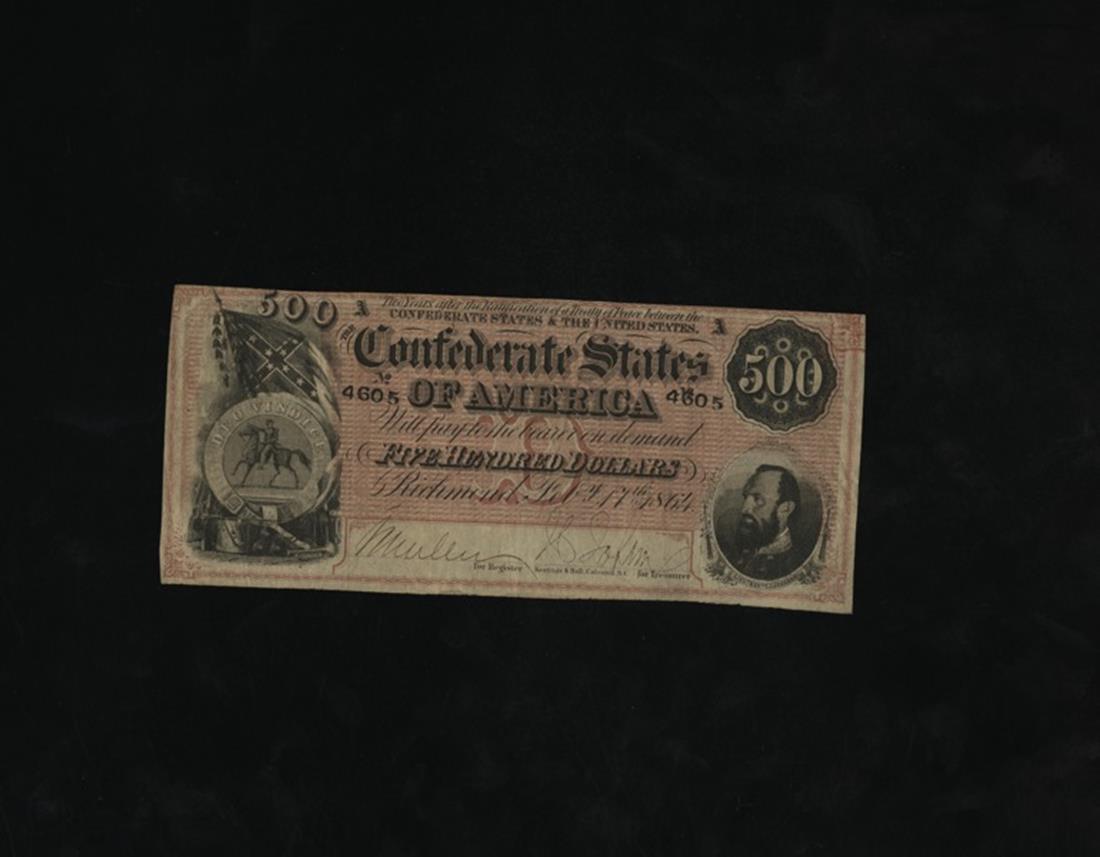 CSA. T-64. $500. 1864. Cr. 489A. PF-1. No.4605. A. Stonewall Jackson. Medium red. Very Fine+. Three nice margins, but trimmed a bit into the top. Quite attractive for the grade.
