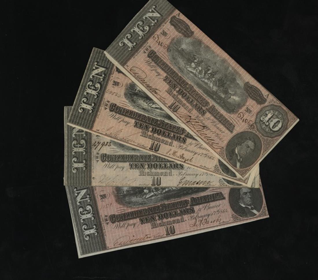 CSA. Quartet of $10 1864 T-68 Notes. Horses pulling cannon. Mostly AU. One example is numbered "621066." (The Thian Register reports 79,481 as the highest observed) . [4]