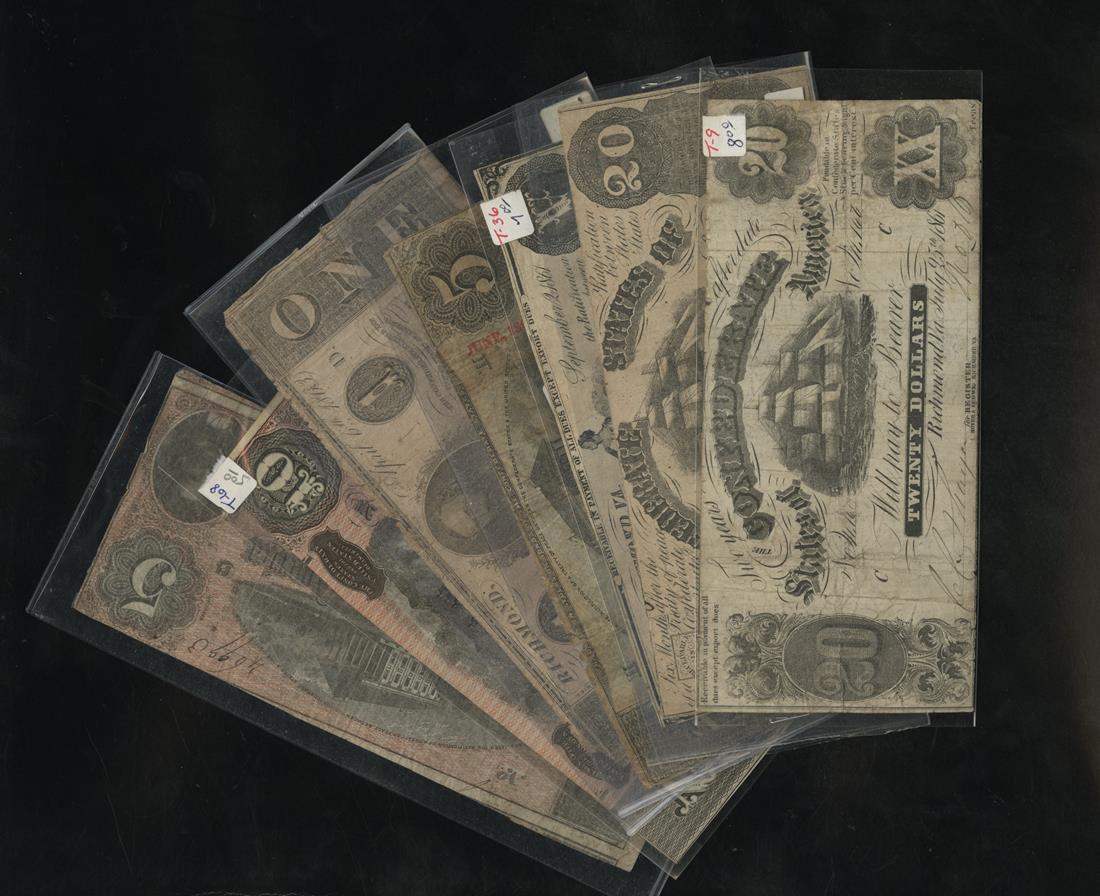 A Useful Assortment of CSA Paper Money. T-9 $20 1861 sailing vessel, Good; T-18 $20 1861 sailor and sailing, vessel VG CC; T-36 $5 Woman on bale of cotton, Fine, pinholes and small body hole; T-60 $5 1863 capital; T-62 $1 1863 Clay; T-68 $10 1864 horses & cannon; T-69 $5 capital. [7]