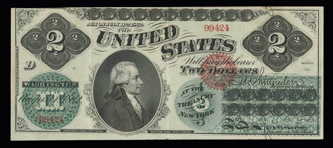 Fr.41. $2. Legal Tender. 1862. Jefferson. No. 99424 D. Extremely Fine. Short fold split at the top.