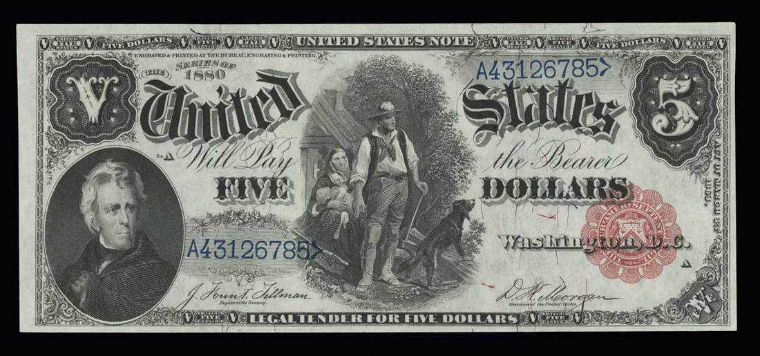 Fr.80. $5. Legal Tender. 1880. Pioneer family. No. A43126785 A. Choice Uncirculated. Fresh and bright, with deep original embossing.