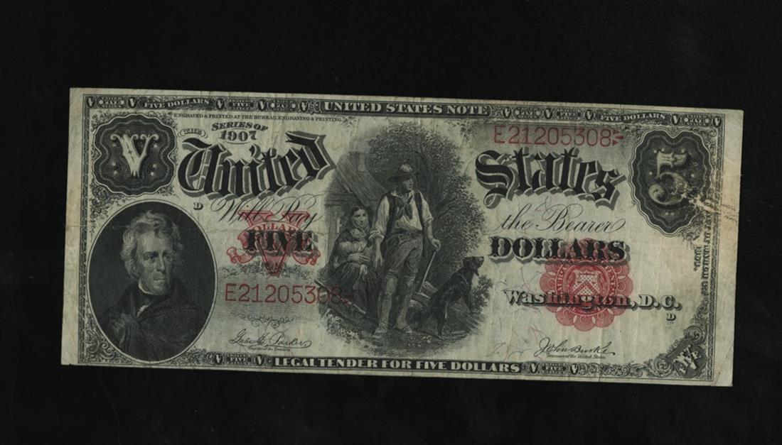 Fr.87. $5. Legal Tender. 1907. Pioneer family. No. E21205308 D. Fine-VF details. Paper scrapes, right end.