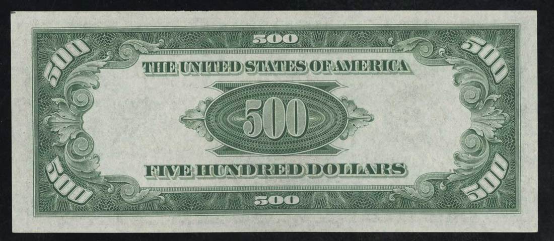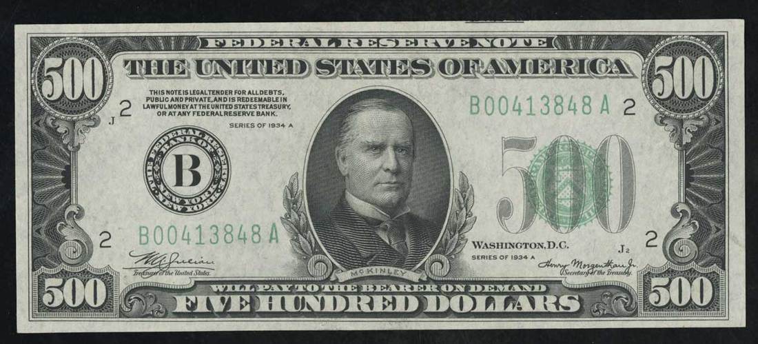 Fr.2202-B. $500. Federal Reserve Note. 1934A. McKinley. No. B00413848A J. Uncirculated. Traces of light teller handling. Also included is a $1 1923 Fr.237, Choice CU. [2]