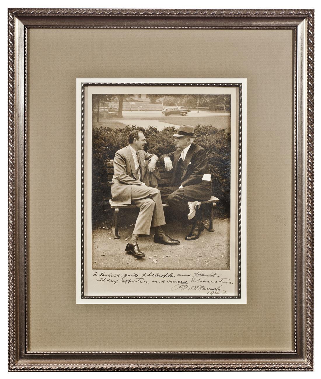 Baruch, Bernard. Framed photograph with sentiment below. "To Herbert, guide philosopher and friend - with much affection and sincere admiration. B M Baruch 1943." Baruch's influence is understated. Although he never held any political offices, he served on many important Commissions including the 1916 Advisory Commission of Council for the National Defense, 1918-1919 War Industries Board, 1919 American Commission to Negotiate Peace, and the Atomic Energy Committee of the United Nations. From the Marty Weiner Collection.