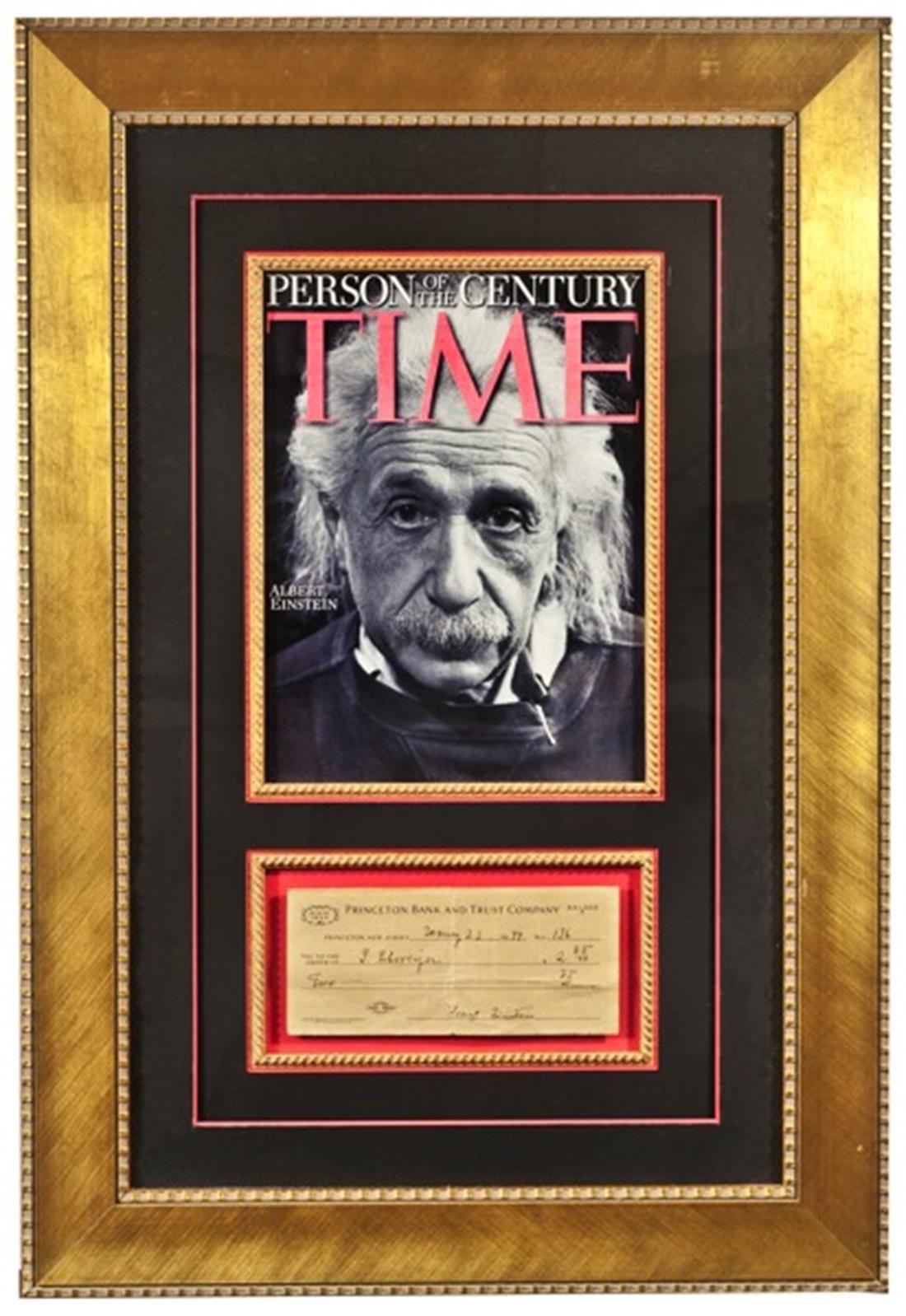 Einstein, Albert. Personal check on the Princeton Bank and Trust Company. February 23, 1944. Beautifully framed and matted with a copy of Time Magazine's Person of the Century issue featuring Einstein. The check has some minor splits but the signature is only slightly affected. From the Marty Weiner Collection.