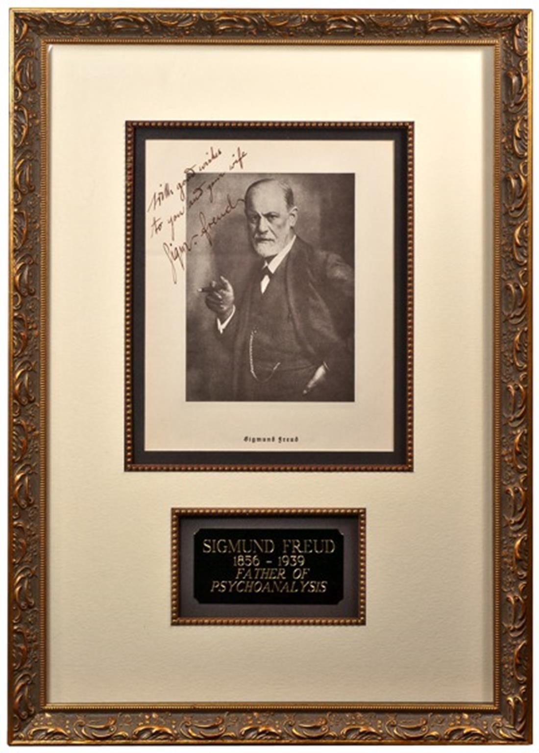 Freud, Sigmund. Framed photograph with sentiment. "With good wishes to you and your wife. Sigm. Freud." Sigmund was an Austrian neurologist who was the founder of psychoanalysis. He was forced to leave Vienna by the Nazis, and fled to London. His treatment involved free association instead of hypnosis, which was widely practiced at one time. He also believed that repressed and forgotten impressions are behind many abnormal mental states. From the Marty Weiner Collection