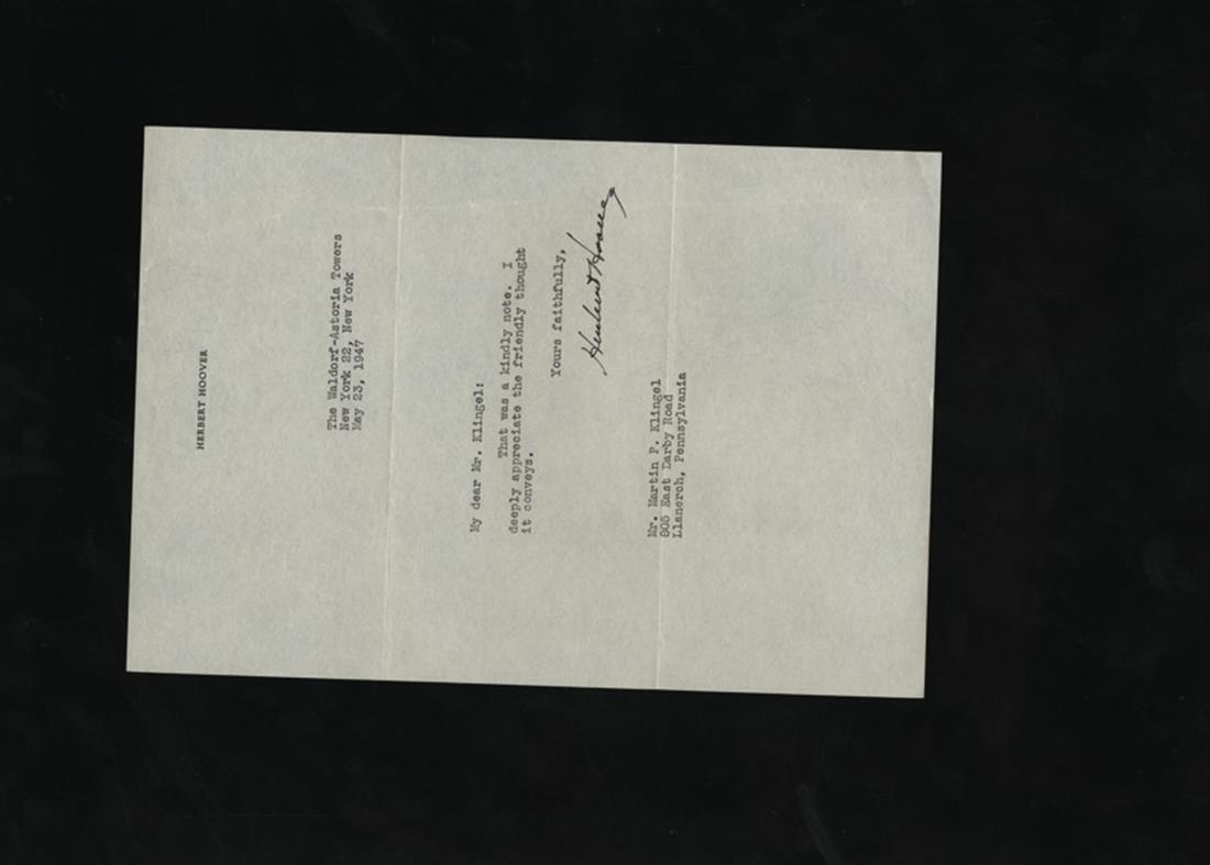 Hoover, Herbert. Thirty-first President of the United States. 8vo. TLS. To Mr. Martin P. Klingel. The Waldorf-Astoria. May 23, 1947. Thank you note signed "Herbert Hoover." Ex Smythe February 1987 Lot 2020. VF+.