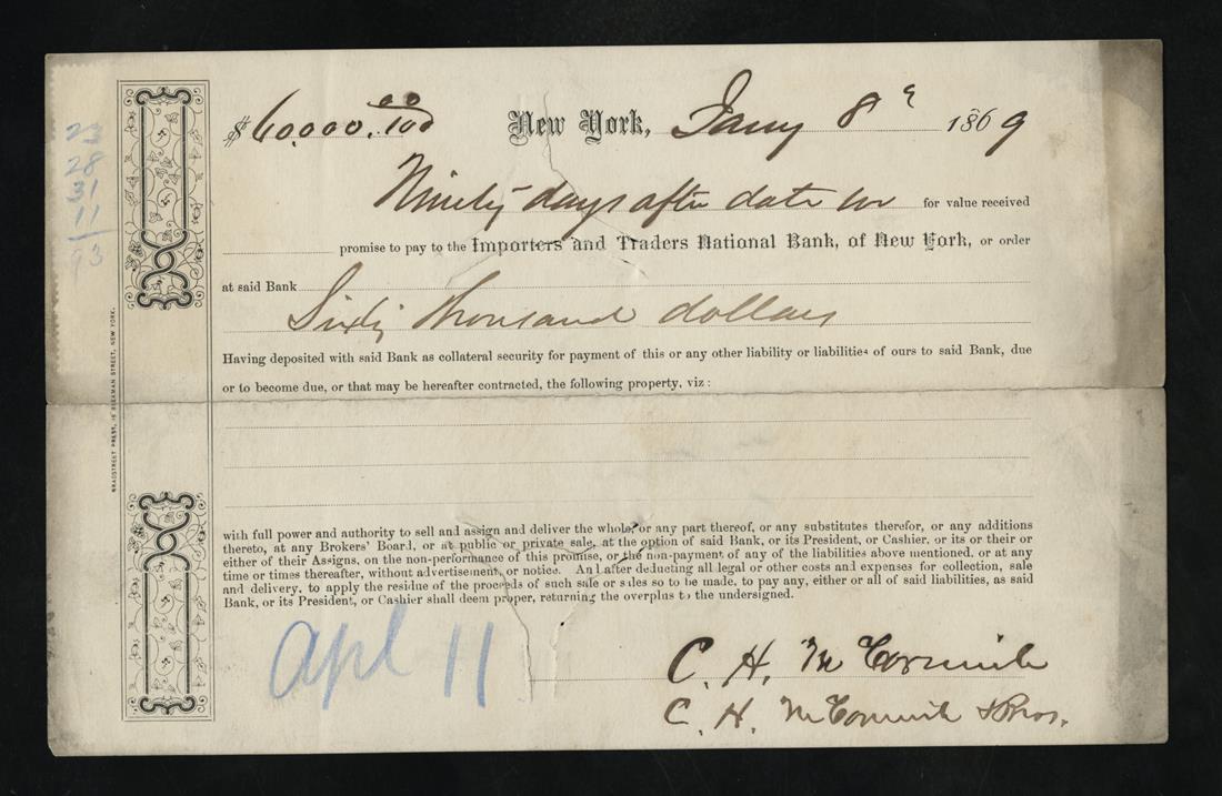 McCormick, Cyrus H. 1869. $60,000. Promissory note. Issued, cancelled. Ornate designs in the left end panel. Signed by Cyrus H. McCormick, who invented a successful reaping machine in 1834. He patented the machine, and along with his brothers, manufactured it. The McCormick reaping machine, introduced at the 1851 International Exhibition in London, was an immediate success. VF. Soiled along the right end, and there is a short fold split. Still quite presentable. From the Marty Weiner Collection.