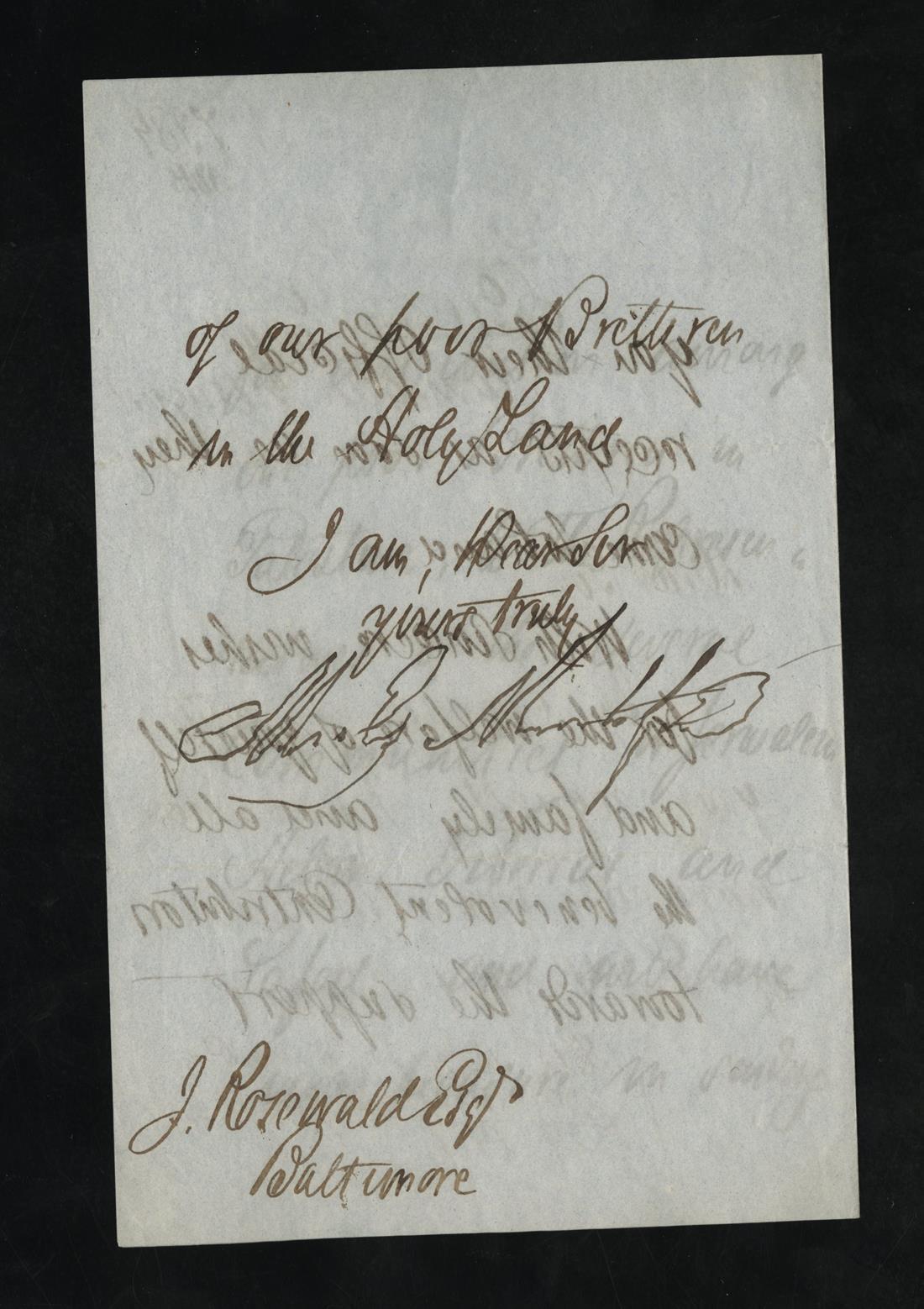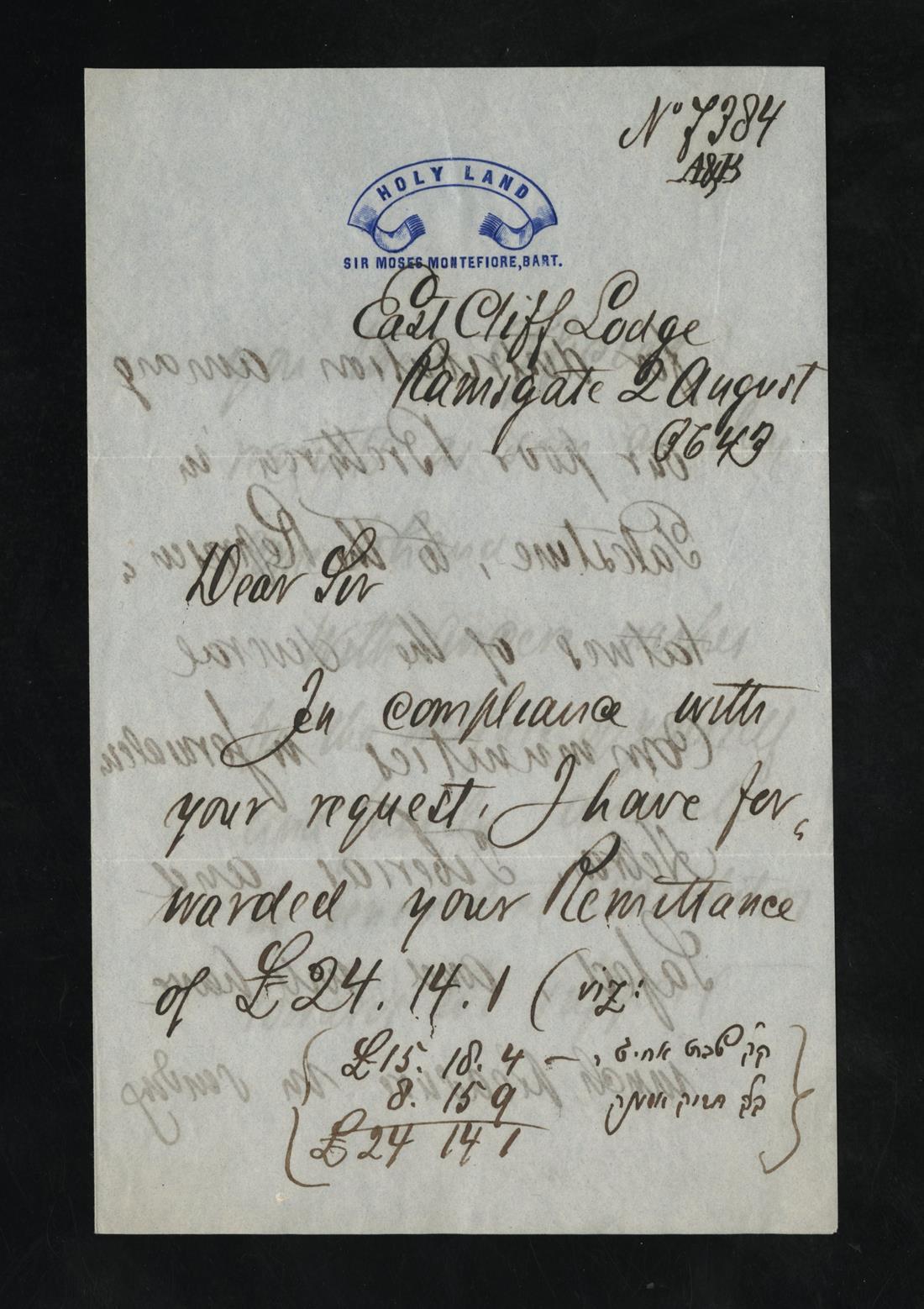 Montefiore, Moses. Signed Letter 8vo. Letter signed by the British financier, pro-Jewish activist and philanthropist. Montefiore complies with a request from J. Rosewald of Baltimore for a donation to aid "…our poor Brethren in the Holy Land." Montefiore amassed a fortune in the London Stock Exchange, then used his wealth and influence to alleviate Jewish suffering around the world. VF+. From the Marty Weiner Collection.