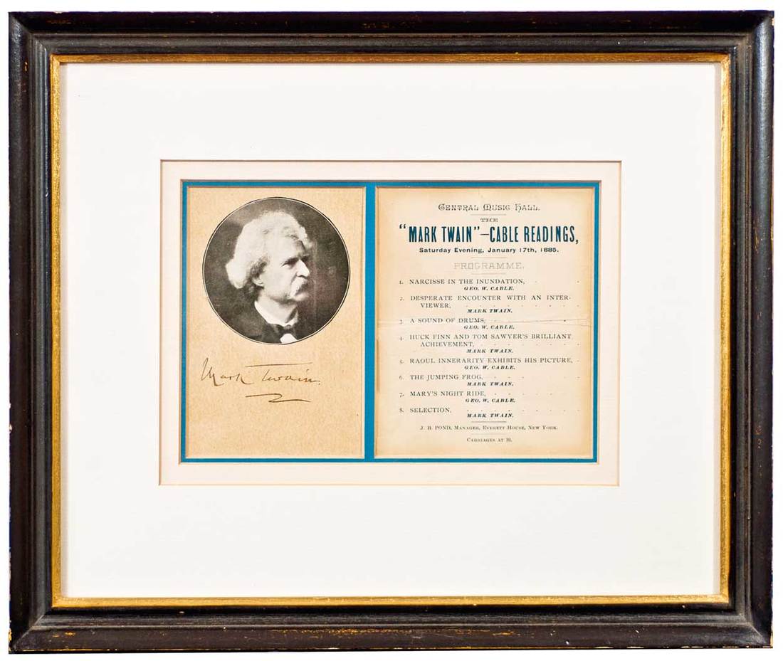 Twain, Mark. Autographed program. January 17th, 1885. General Music Hall, Everett House, New York. Portrait of Samuel Clemens. Beautifully matted and framed. Twain lectures on his famous "Jumping Frog." He shares the stage with George W. Cable, the novelist specializing in stories about Creole Louisiana. Mark Twain found himself in financial difficulties brought on by poor investments in the publishing industry. He backed a typesetting machine which never quite functioned successfully, and he invested in Charles L. Webster and Company, which eventually failed. Twain turned to the lecture circuit to cover the debts he incurred. Excellent "Mark Twain" signature. From the Marty Weiner Collection.