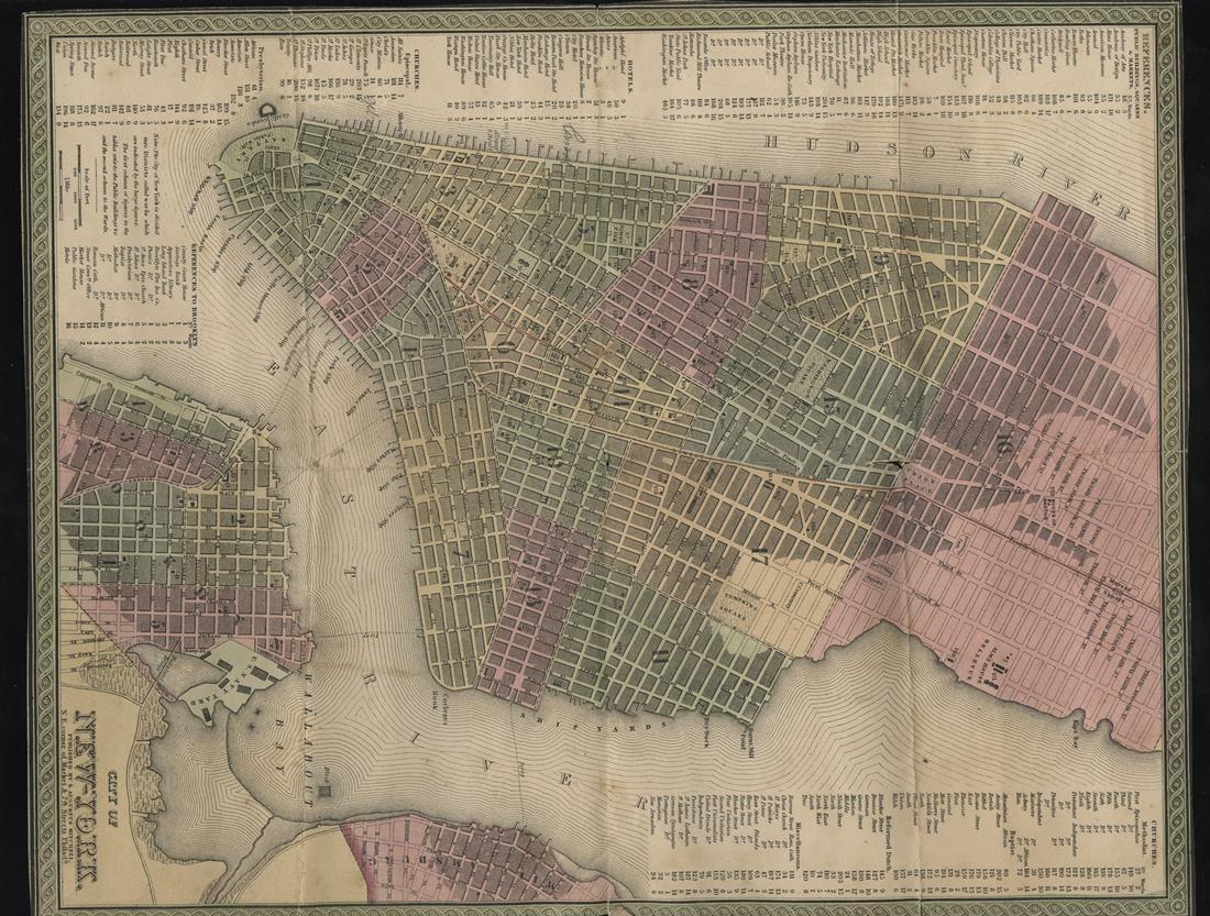 New York City. 19th Century map of the city showing locations of public buildings, squares, markets, hotels, and churches. By S. Augustus Mitchell, Philadelphia. 12 ¼ x 15 ¼". From southern tip of the island to 37th Street. Areas marked off in light pink, yellow, slate-gray, yellow and green. Locator keys at left and right of map. Small split along center fold and small bend-split right side. About Fine.