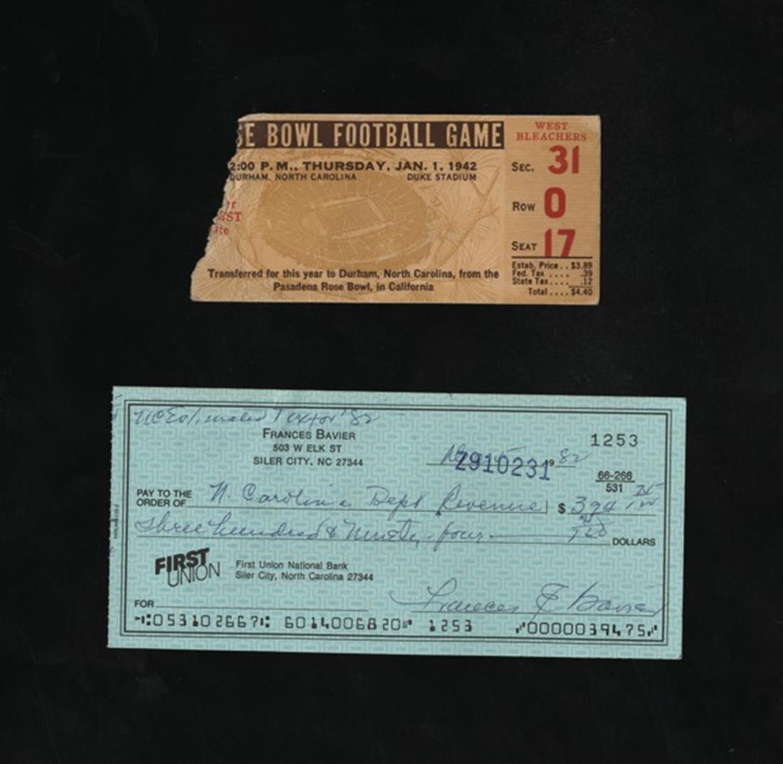 North Carolina pair: Bavier, Frances Elizabeth. Stage and TV actress best known for her role as Aunt Bea on The Andy Griffith Show and Mayberry R.F.D.. Document Signed "Frances E Bavier". Check made out to the N. Carolina Dept [of] Revenue for $394.75, Dec. 5, 1982. Very Fine; and 1942 Rose Bowl Ticket. For the West Bleachers at Duke Stadium, Durham, NC. The January 1, 1942 Rose Bowl scheduled to be played in Pasadena, CA was moved to Durham, NC out of fear of a Japanese attack on the West Coast after Pearl Harbor. Left stub and small piece of left side torn (from admission). Very Fine and Rare. [2]